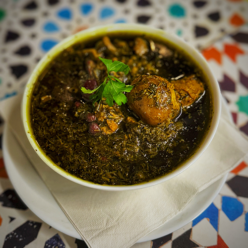 Ghormeh SabziA fragrant Persian stew made with slow-cooked finely chopped herbs, kidney beans, sun-dried limes, and tender beef, served with aromatic saffron rice. A rich and flavorful Persian favorite.