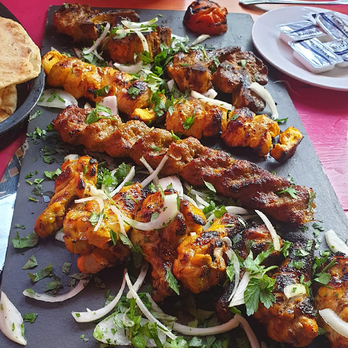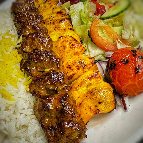 Mixed GrillA delicious combination of one skewer of juicy lamb and one skewer of tender saffron chicken, grilled to perfection and served with aromatic saffron rice. A perfect choice for those who want to savor the best of both worlds.